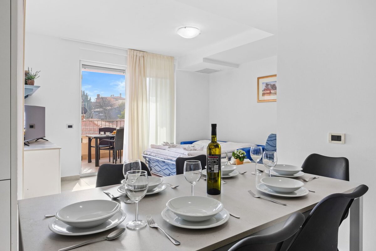 The apartments come equipped with every comfort: complete kitchen, bed linen, air conditioning, Wi-Fi, LCD TV and a kitchen cleaning kit. Your stay also includes access to the pool with sun loungers, utilities and final cleaning. A practical, welcoming place that lets you enjoy Premantura without giving up the comforts of home.