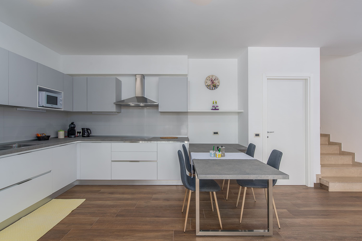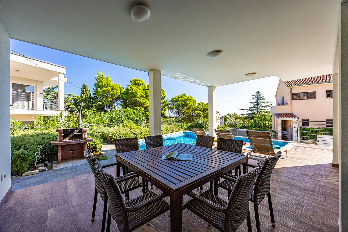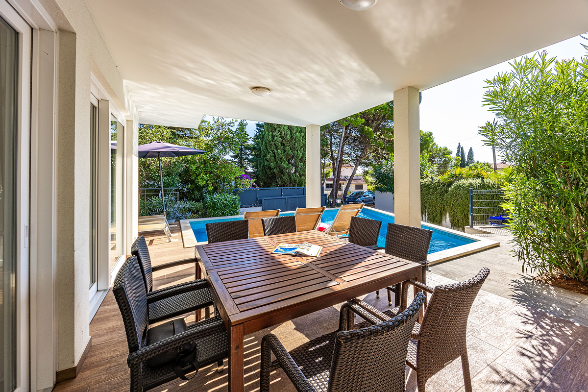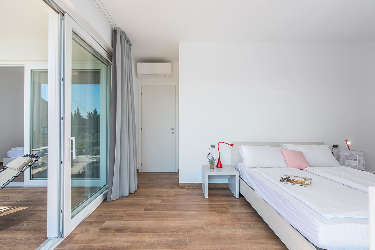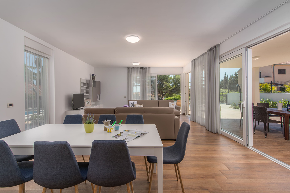 Villa Paliska can accommodate up to 12 people in 6 spacious bedrooms. The presence of 4 modern bathrooms ensures privacy and comfort for every guest. The indoor spaces are perfect for groups and families looking for large, bright, and functional environments, while the terrace and the pool offer moments of relaxation in complete tranquility.